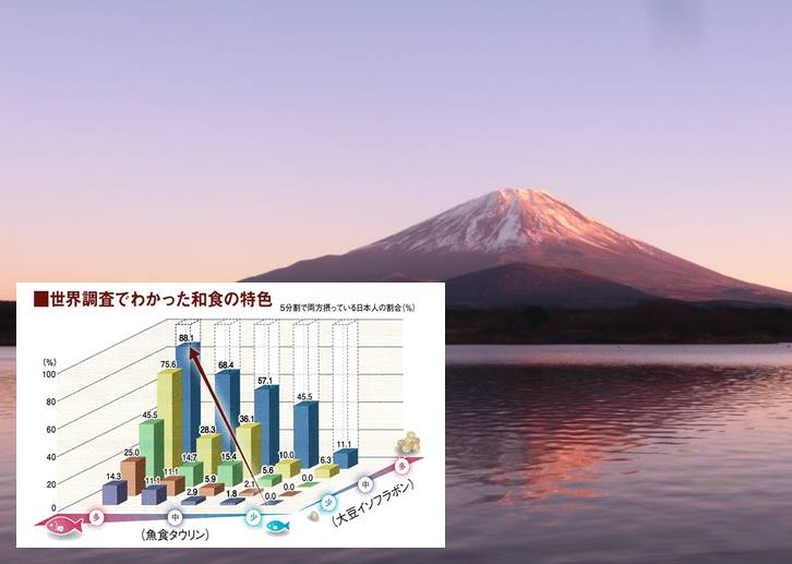 この研究は、塩なしでの食生活で高血圧もなかったマサイ族から、海抜3700mの高地で塩茶、バター茶を多飲して重症高血圧の多いチベット族まで、まる一日の24時間尿を集めて貰い、塩分摂取と高血圧や脳卒中死亡率との正相関を実証しました。そして、日本食の特色も30年余にかけてようやく分かりました。24時間尿による栄養チェックという、同じ物差しで世界の様々な民族の食事を比較した初めての研究で分ったのは、大豆のイソフラボン、魚のタウリンを摂っている人では、動脈硬化で心臓の血管が詰まる心筋梗塞が少なかったのです。実は日本人は、世界一、大豆・魚の両方を食べているのです。その為、寿命に影響する心筋梗塞の死亡率が先進国中で最低で、世界一の平均寿命が保たれているのです。