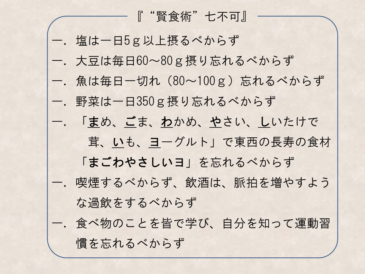 WHOは「賢く食べて(Eat Wisely)健康に生きよう(Live Well)」と世界に呼びかけています。この賢く食べる“賢食術”を実践する第一歩として次の“七不可”を守って下さい。