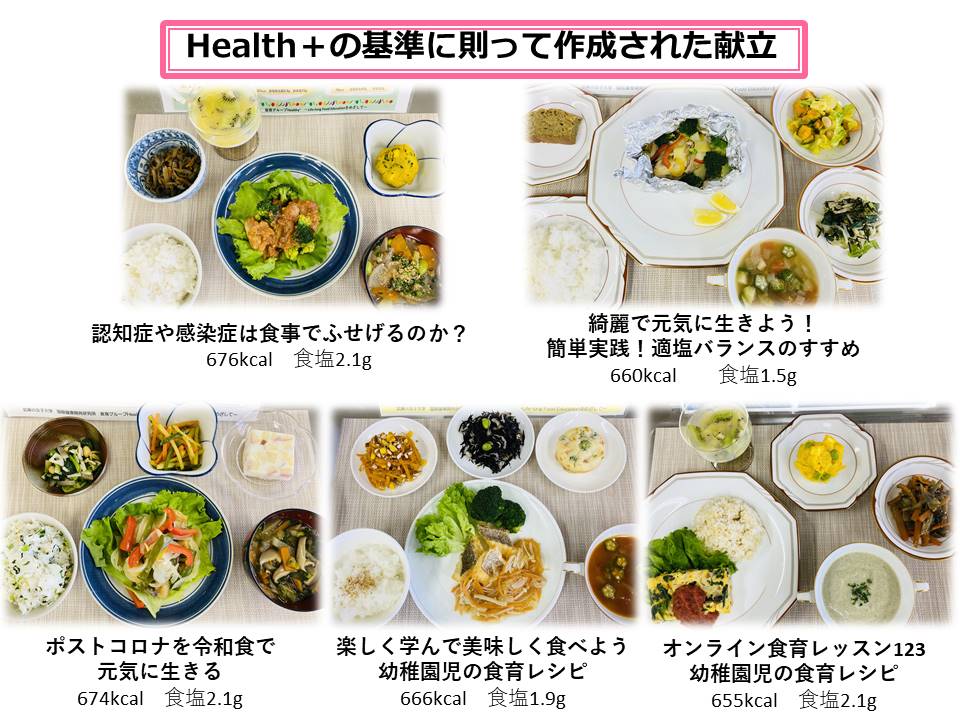 2008年に西宮市で立ち上げた食育グループHealthy+(ヘルシープラス)では、毎年、食育の科学的な根拠を学んだ学生や一般の方々が、体験食育講座でお披露目する「美・ランチ」(図1)の開発を進めています。この「美・ランチ」は、毎日食べ続けると2週間でNa/K比が改善したり1)、1カ月で動脈硬化指数が改善2)したりするなどの研究成果が得られた献立の基準になります。2021年度も5組のグループが「適塩でまごはやさしい」献立を作成しました(図2)。適塩は、少しの調理の工夫で美味しく仕上げることが可能であることが分かっています。そして、栄養士や管理栄養士という専門職でなくても、コツをつかむことで作成する事が可能なのです。このような地道な食育活動を継続することで、微力ながら研究成果の社会還元に貢献できていると理解しています。